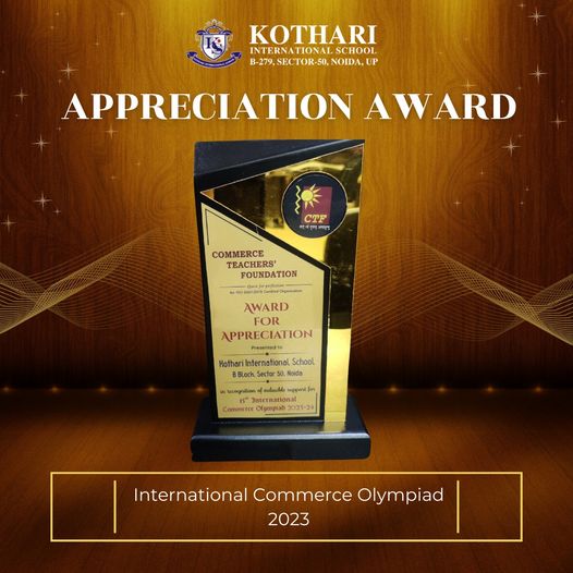Congratulations to the brilliant minds of Kothari International School, Noida! We are thrilled to announce the outstanding achievements of our students in the International Commerce Olympiad 2023. Let's give a big round of applause to our winners: Hiten Singh (Grade 12), Shiney Soorma (Grade 11) - Excellence & Merit Certificate along with a trophy Baani Luthra, Jiya Kadate, Navya Manchanda, Sarvagya Mahajan, Suhani Bansal, Syed Bashar Ahmad, Jeevika Arora, Trisha Upadhyay, and Navya Jain (Merit Certificate) We are incredibly proud of their hard work, dedication, and exceptional performance! Additionally, we are thrilled to share that Kothari International School, Noida, has been honored with an appreciation trophy for our outstanding participation.